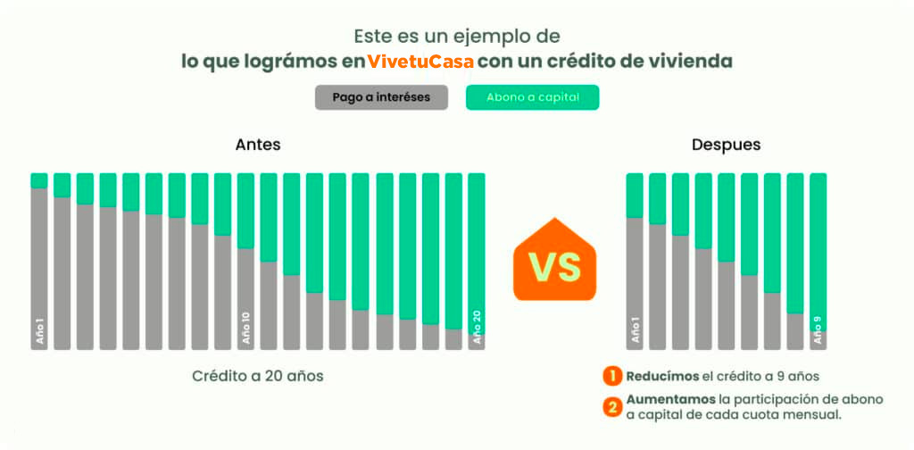 - Aplicar la ley de vivienda con VivetuCasa para que el banco reconozca de tu pago mensual un porcentaje más alto al abono a capital y reduzca el pago de intereses. Con esto el banco reconoce un abono más grande a tu deuda mes a mes y serías dueño de tu vivienda mucho más rápido.